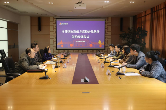 11月28日上午,我校与多邻国英语测试及新东方教育科技集团举行高校合作伙伴签约暨授牌仪式。多邻国中国区市场经理刘柳、新东方武汉国际教育培训中心总经理张莉等一行出席仪式,并与我校副校长罗航、国际学院副院长张立等进行座谈交流,仪式由张立副院长主持。