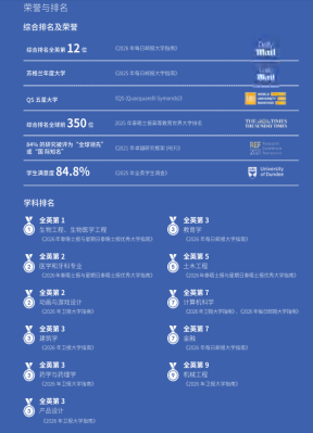 名校实力,世界公认:邓迪大学是一所享誉全球的顶尖学府,其卓越实力备受权威认可:不仅在2025年《每日邮报》大学排名中高居全英第十,荣膺 “苏格兰年度最佳大学” 称号,更获得了QS世界大学五星级认证,奠定了其世界级的教育水准。